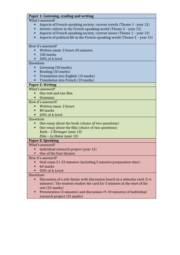 A Level French Aqa Exam Breakdown Info Sheet Teaching Resources